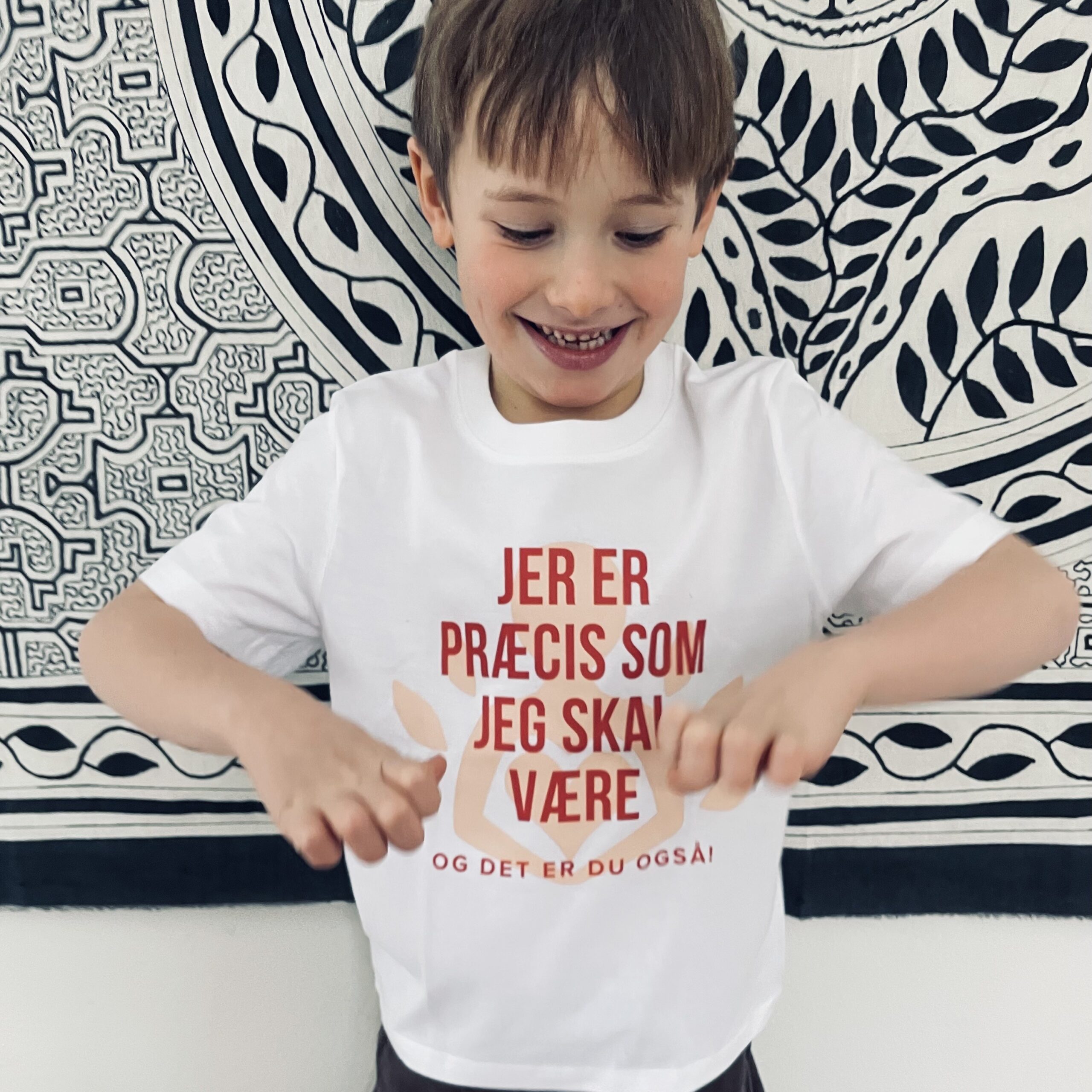Med teksten “Jeg er præcis som jeg skal være” bærer barnet en vigtig påmindelse om selvværd, tryghed og accept. Et sundt budskab, der ikke kun styrker barnet selv, men også sender et klart signal til omgivelserne: Her er plads til at være sig selv – præcis som man er og præcis som du er.